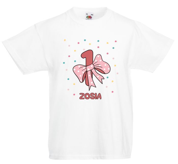 Koszulka na roczek z imieniem i kokardą z okazji pierwszych urodzin dziecka.