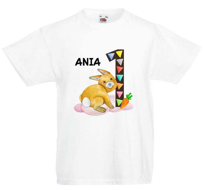Koszulka na roczek z imieniem i królikiem z okazji pierwszych urodzin dziecka.