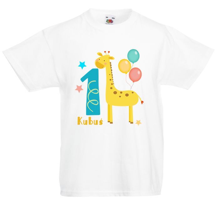 Koszulka na roczek z imieniem i żyrafą z okazji pierwszych urodzin dziecka.