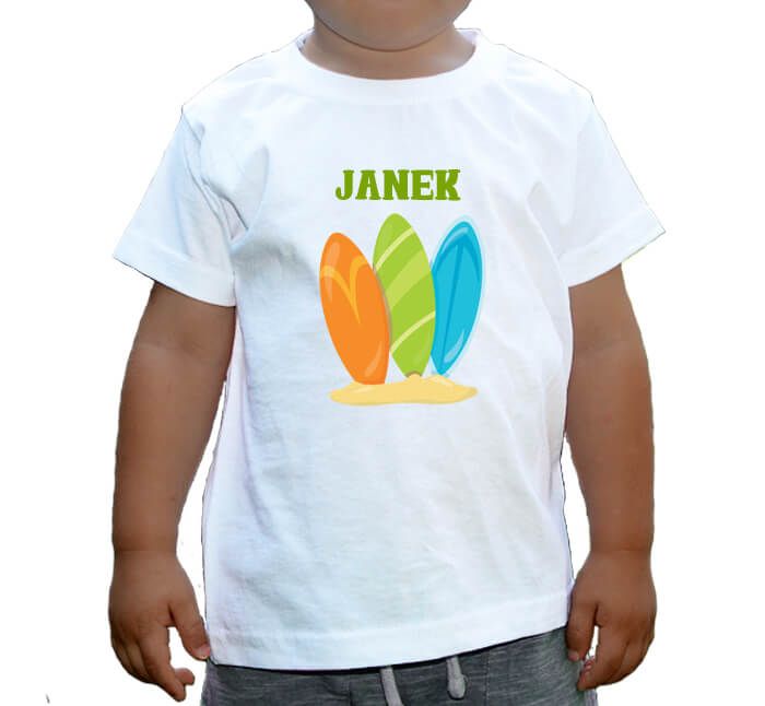Koszulka dziecięca z imieniem deski surfingowe kazdego chłopca. Kolorowe deski do pływania po morskich falach. Pomarańczowe, niebieska i zielona to kolory dla odważnego surfera.