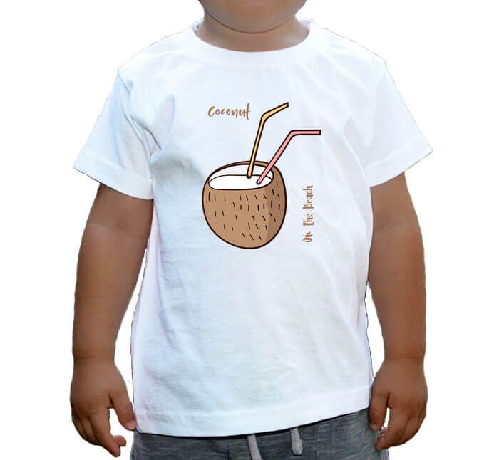 Koszulka dziecięca i młodzieżowa "Coconut" przygotowana jest w jasnych barwach. Koszulka jedna ładniejsza od drugiej. Wszystkie wyglądają zachęcająco i pysznie. Przecięty kokos z dwoma słomkami oferuje orzeźwiające mleczko kokosowe.
