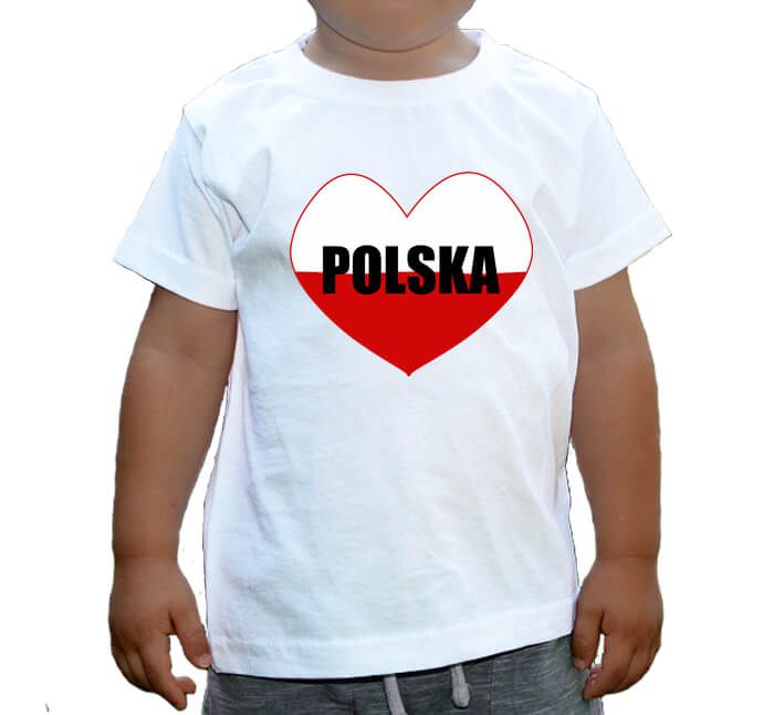 Koszulka dziecięca Polska serce ma nadrukowane serce w kolorze flagi oraz napis Polska.