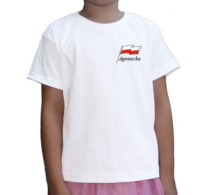 Koszulka dziecięca z imieniem i flagą Polski to taki szkolny wzór na dzień niepodległości, który doceniała nie jedna mama. Mały nadruk jest bardzo pratyczny. Koszulkę można wykorzystywać również jako odzież na w-f.