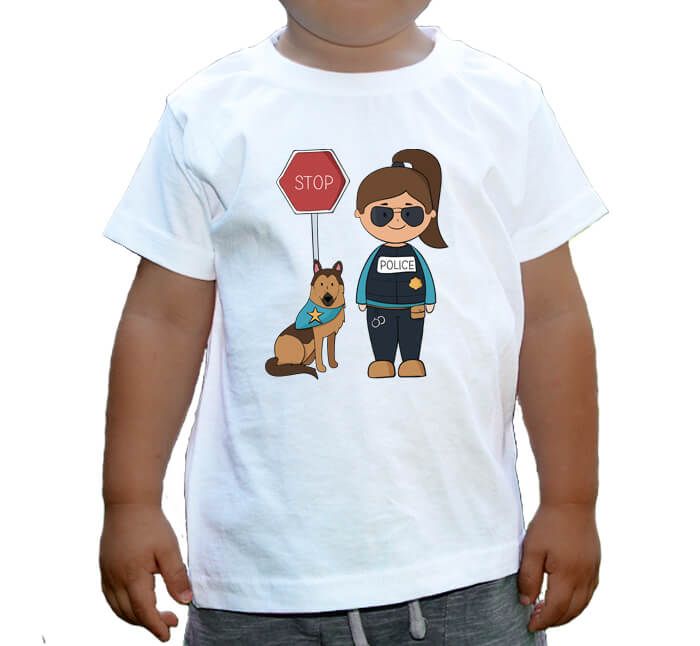 Koszulka dziecięca Patrol przedstawia policjantkę wraz z psem na służbie. Seria Police. Koszulka dla małych fanów pościgów, zabaw w policjanta i złodzieja.