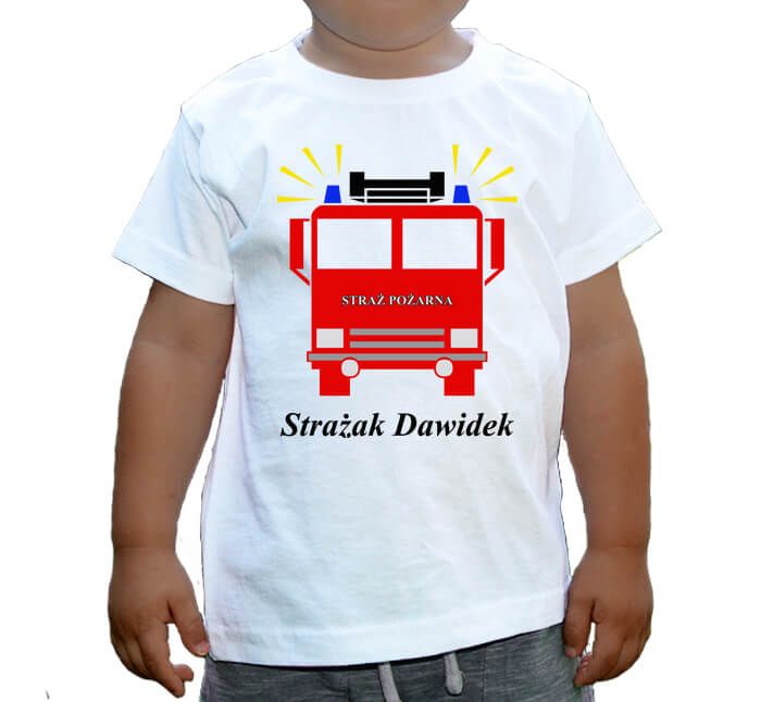 Koszulka dziecięca z wozem strażackim podpisanym Strażak + imię dziecka.