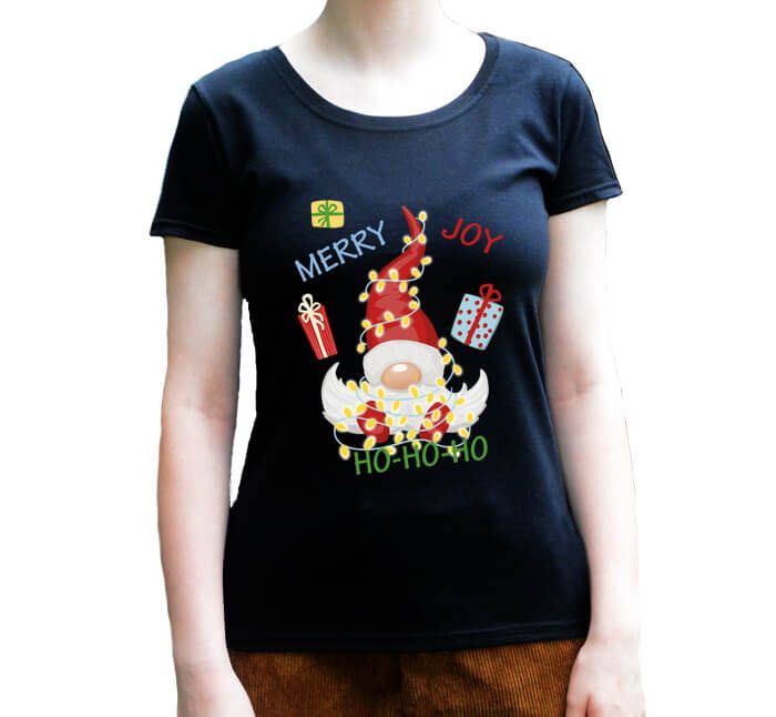 Koszulka świąteczna damska ze skrzatem zaplątanym w świąteczne lampki.