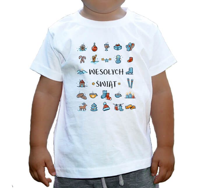 Koszulka świąteczna z ikonkami zimowych aktywności oraz symbolami świąt.