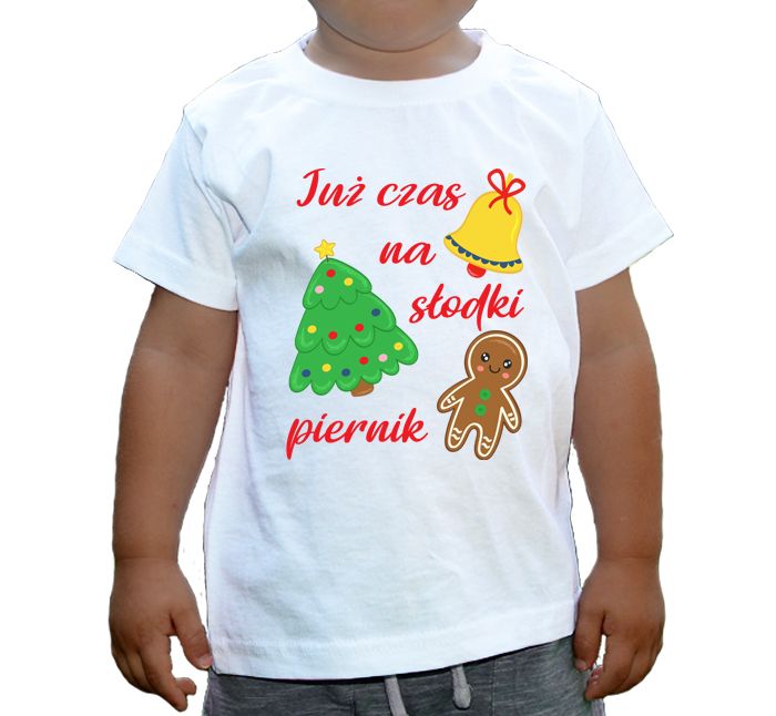 Koszulka świąteczna z piernikiem, choinką i żółtym dzwoneczkiem opatrzona jest napisem Już czas na świąteczny piernik.
