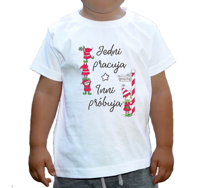 Koszulka świąteczna Jedni pracują Inni próbują doładnie pokazuje jak to w życiu czasem jest. Gdy jedni są pochłonięci przygotowaniami do świąt, inni w tym czasie udają, że pracują albo zajmują się zupełnie czymś innym. Na koszulce jest zabawna grafika. Trzy elfy próbują zawiesić zieloną gałązkę gdzieś bardzo wysoko. Z samych siebie utworzyły drabinę i stojąc jeden na drugi, chcą przystroić dom. W tym samym czasie, w innym miejscu jeden psotny elf nie oparł się swojej ciekawości i spróbował czy lód na słupie na pewno jest zimny. Wiemy, jak takie zachowanie się kończy.