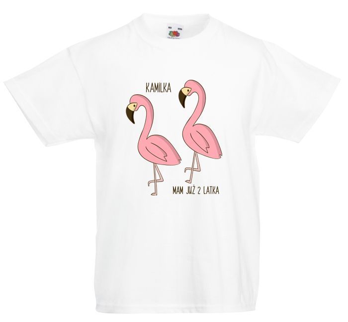 Koszulka na 2 latka z imieniem i flamingami z okazji drugich urodzin dziecka.