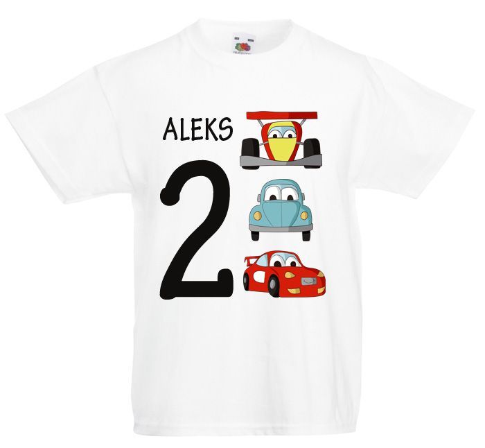 Koszulka urodzinowa 2 z autami. Podaj imię do nadruku w zakładce: "Personalizuj". Jeśli nie chcesz imienia, poproszę napisz to.