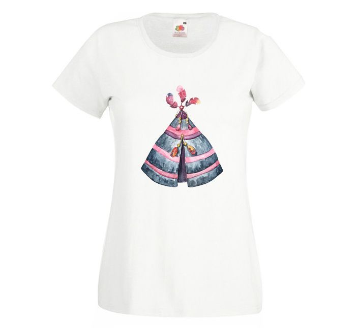 Koszulka damska Wigwam w przepięknych barwach przypomina o letnich wędrówkach i niezapomnianych przygodach. Sam wigwam przywołuje plemienne czasy. Wiemy doskonale, że prawdziwa kolorystyka była zupełnie inna, ale kto nie pozwoli naszej wyobraźni ubarwić świat na swój sposób.