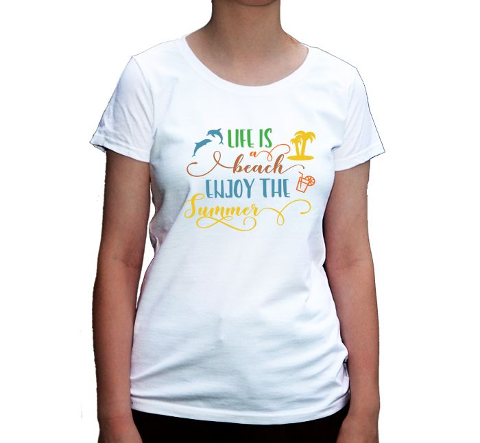 Koszulka damska Life is a beach Enjoy the summer z nadrukiem cyfrowym. Koszulka z kolorowym napisem.
