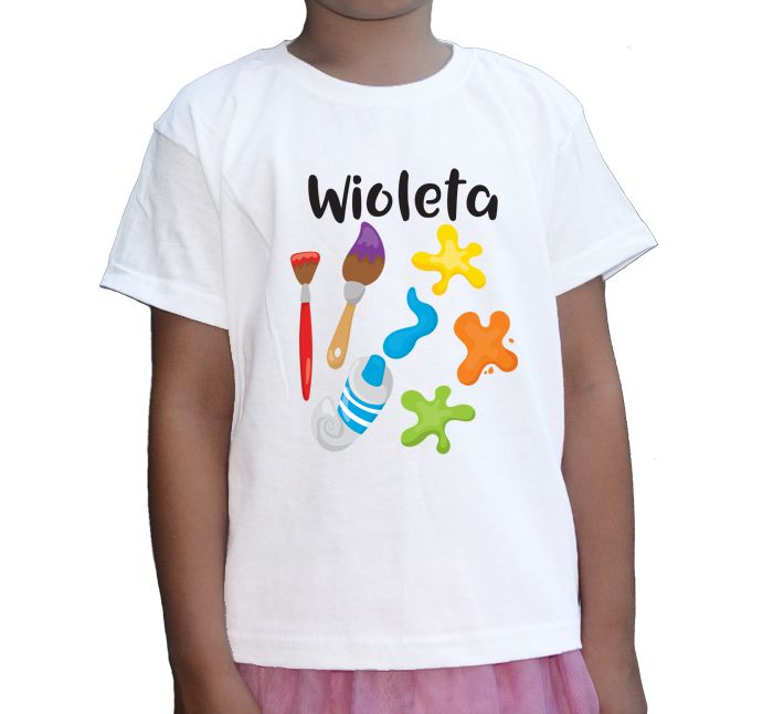 Koszulka dziecięca z imieniem klesy z farb. Lubisz zabawę farbami i kolorowe kleksy. Czerwony i brązowy pędzel zapraszają do zabawy , a żółte, pomarańczowe, zielone i niebieskie farby do malowania.