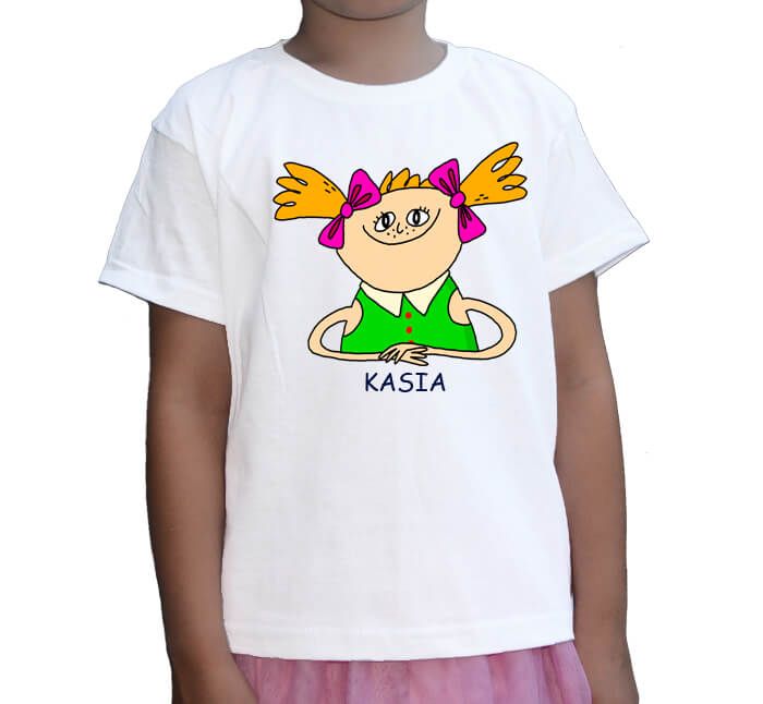 Koszulka Uczennica z imieniem dziecka dla dziewczynki. Grzeczna uczennica pilnie się uczy w szkole. Dziewczynka ma zielone ubranko z czerwonymi guzikami i białym kołnierzykiem. Uczesna jest w dwie kitki. Ma ufne, dziecięce spojrzenie i uśmiech na twarzy.