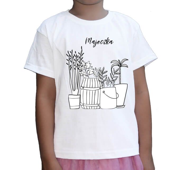 Koszulka z imieniem dziecka i rośliny w wielkich doniczkach jest to kolejna propozycja, którą można samodzielnie pokolorować.