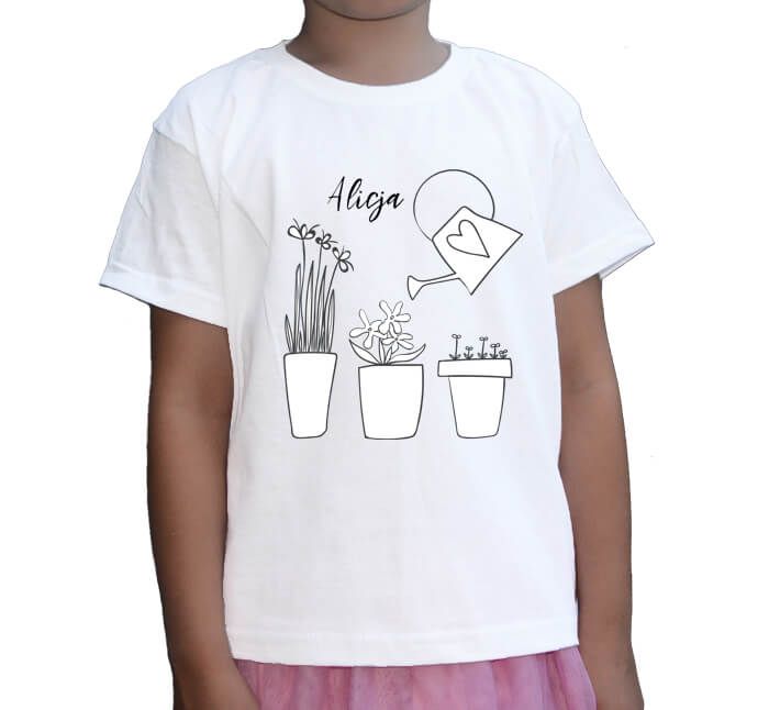 Koszulka z imieniem Rośliny i konewka przypomni o codziennym podlewaniu kwiatów. Niby to nie uciążliwy obowiązek, ale pamiętać trzeba. Nie każdy potrafi temu podołać nawet gdy bardzo chce.