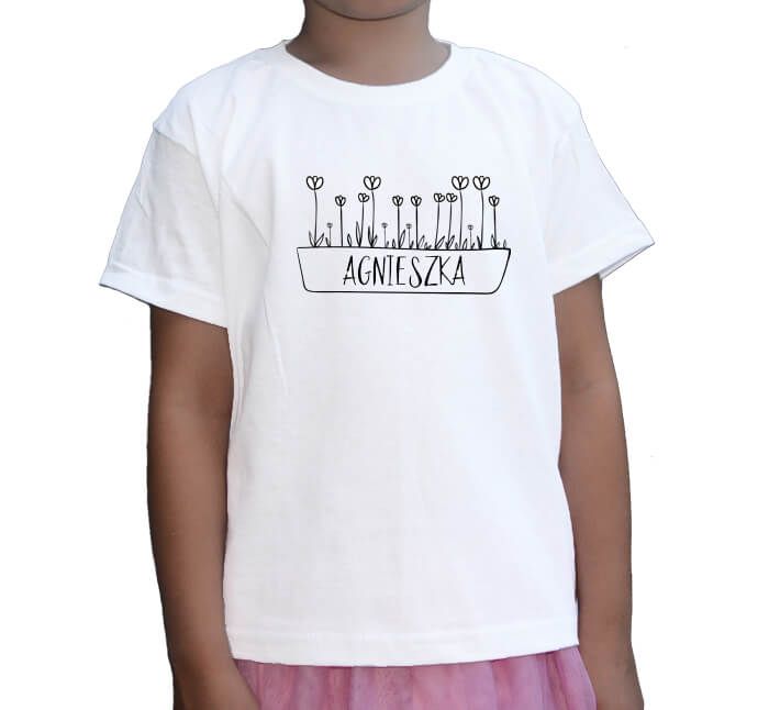 Koszulka dla dziewczynki ze skrzynką kwiatów z imieniem