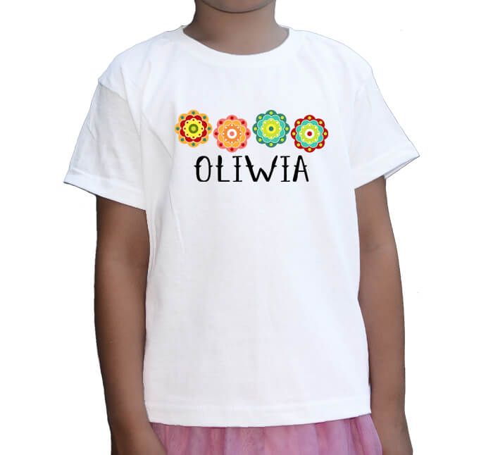 Koszulka z imieniem meksykańskie kwiaty stworzona z myślą o dziewczynach. Takie kwiaty nie istnieją w rzeczywistości. Są barwne i różnorakie.
