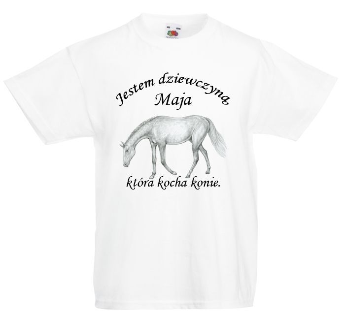 Koszulka z imieniem dziecka i napisem: Jestem dziewczyną, która kocha konie. Napis można zmodyfikować i zamiast dla dziewczyny, zrobić dla chłopaka. Jestem chłopakiem, który kocha konie. Koń jest bardzo pięknym zwierzęciem. Bardzo często jest tematem hobby małych dziewczynek, które otaczają się ich wizerunkami.