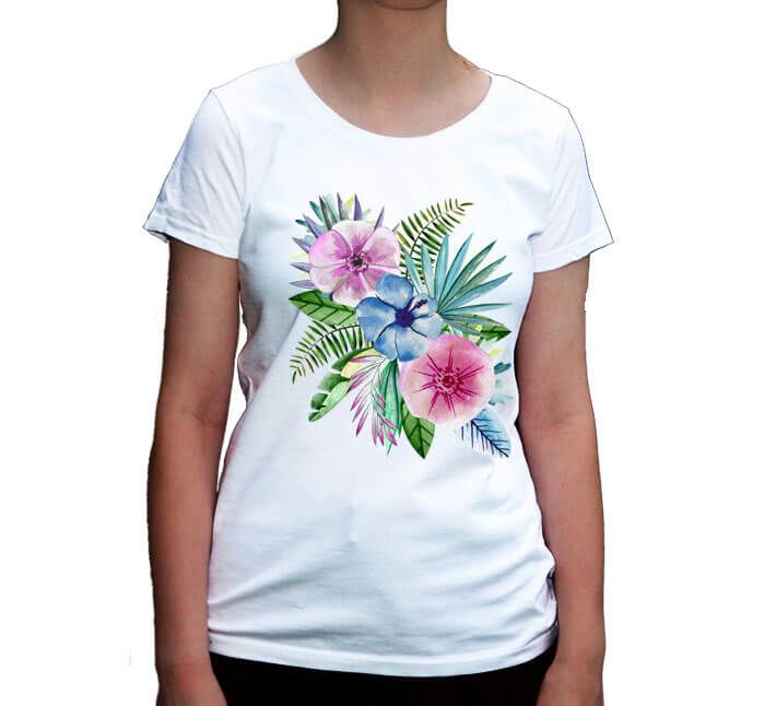 Koszulka kwiaty tropików. Koszulkę można spersonalizować dodając dowolny napis poniżej lub powyżej kwiatów. Samej wiązanki nie można zmodyfikować.