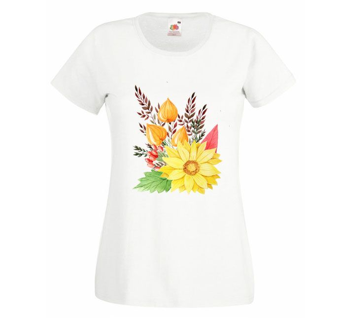Koszulka jesienne kwiaty. Koszulkę można spersonalizować dodając dowolny napis poniżej lub powyżej kwiatów. Samej wiązanki nie można zmodyfikować.