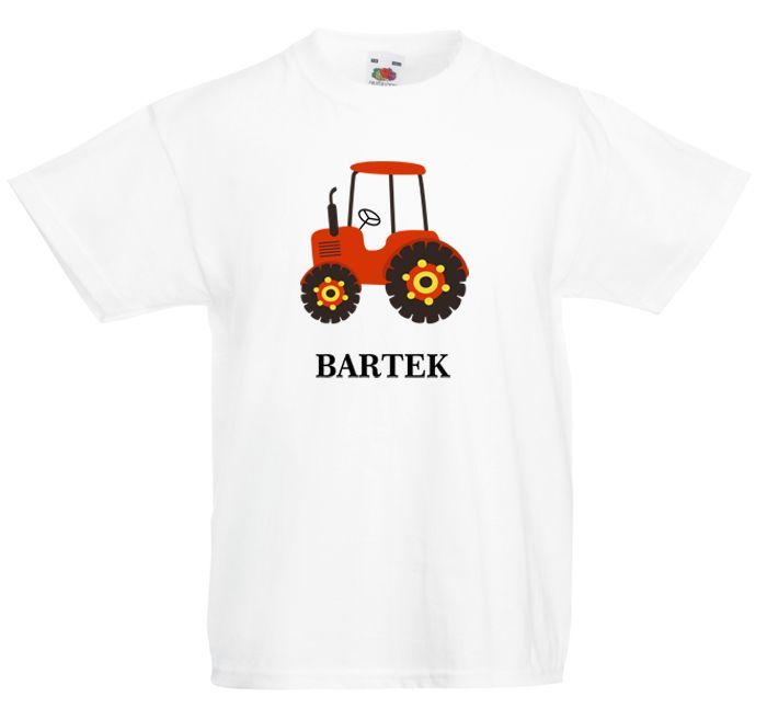 Koszulka z traktorem dla chłopca przypadnie do gustu dzieciom w różnym wieku. Traktor z imieniem. Czerwony traktor jest bardzo lubiany jako ozdoba chłopięcej garderoby. Podaj imię jakie ma być wydrukowane w zakładce personalizuj. Traktor jest czerwony. Ma czarne koła z żółtymi śrubami.