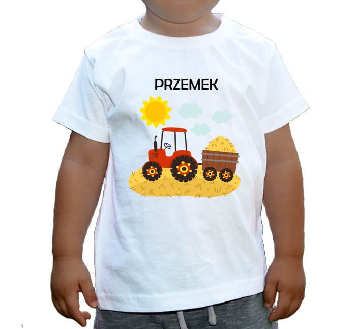 Koszulka z traktorem na polu z imieniem. Koszulka drukowana na zamówienie. Podaj imię w zakładce "Personalizuj".