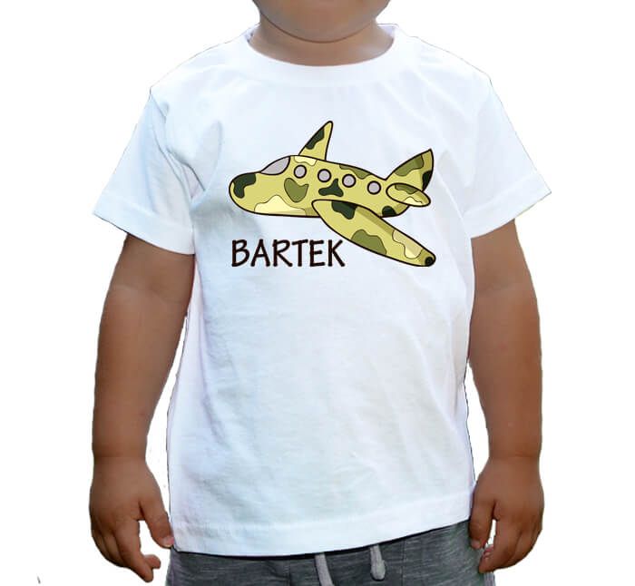 Koszulka Samolot z imieniem dla dzieci z wojskowym, plamiastym samolotem. Moro maskuje obecność pojazdów i żołnierzy na lądzie. W przestrzeni powietrznej prosiłoby się o kolor biały lub niebieski, albo błękitny w chmurki. :)