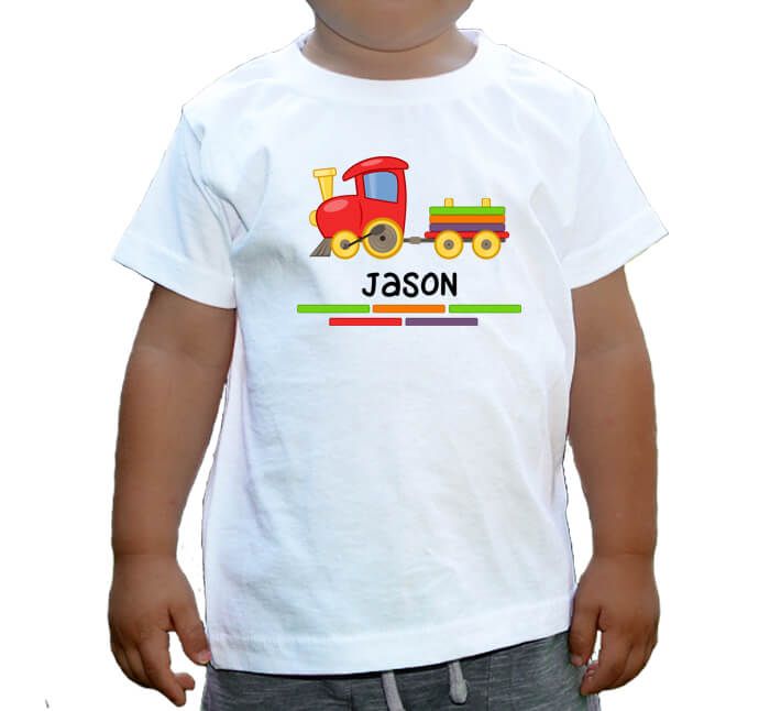 Koszulka Pociąg z imieniem dziecka dla chłopca. Kolorowa ciuchcia wesoło rusza w świat.