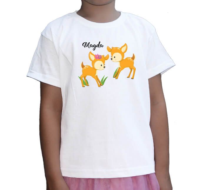 Koszulka Jelonki z imieniem, biegające po leśnej łące. Jelonek dziewczynka i Jelonek chłopiec. Sarenki w leśnej ciszy na zielonej trawce.