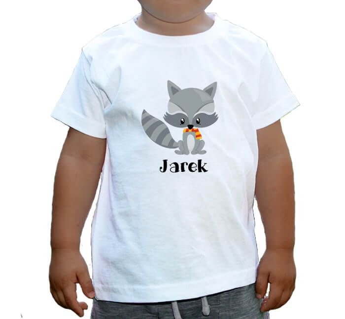 Koszulka dziecięca Szop z imieniem dziecka. Szop jest szary i ma czerwono żółty szaliczek w paski.