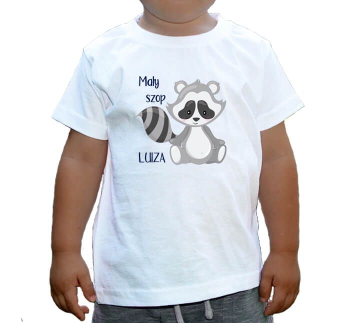 Koszulka Mały szop z imieniem Twojego dziecka ucieszy obdarowanego lub obdarowaną. Szop jest cały w szarościach o różnym natężeniu. Szopy to psotne zwierzęta. Szopy są wszystkożerne. Głownie występują w Ameryce północnej. Często widzimy wfilmach obrazki jak szopy zakradają się do domów w poszukiwaniu pożywienia.