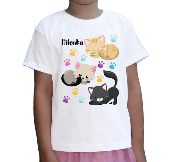 Koszulka Kotki z imieniem dziecka. Podaj je z zakładce Personalizuj. Kotki są kolorowe i bardzo sympatyczne.