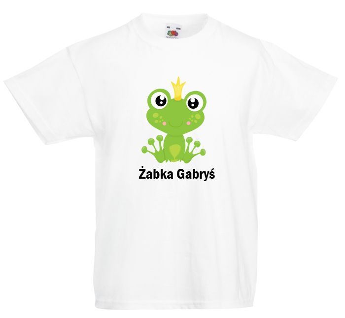 Koszulka z żabką dla chłopca z dowolnym imieniem dziecka. Żabki występują w dwóch wesjach i różnią się tylko wielkością korony. Ta koszulka z żabką może być równie dobrze dla dziewczynki i dla chłopca. Żabka pasuke każdemu, a spiczasta korona tym bardziej. Dlaczego są dwie wersje. Aby było weselej i aby koszulki dla dziewczynek różniły się od tych dla chłopców.