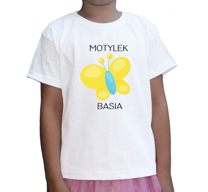 Koszulka Motylek z imieniem dziecka. Koszulka z motylkiem dla dziecka z jego imieniem. Koszulka nadaje się dla grupy przedszkolnej. Motylek jest żółty z niebieskim ciałkiem. Nad grafiką jest napis "Motylek", a pod spodem imię dziecka.