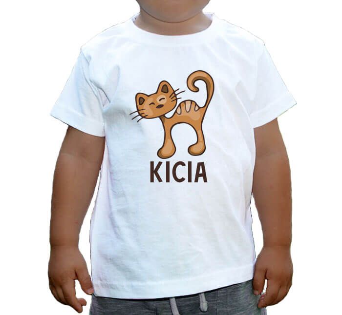 Koszulka dziecięca Kicia dla małego dziecka. Sam podpis można zmodyfikować i może być kotek, kotka, kociątko, koteczek, kot, kocur albo po prostu imię dziecka.