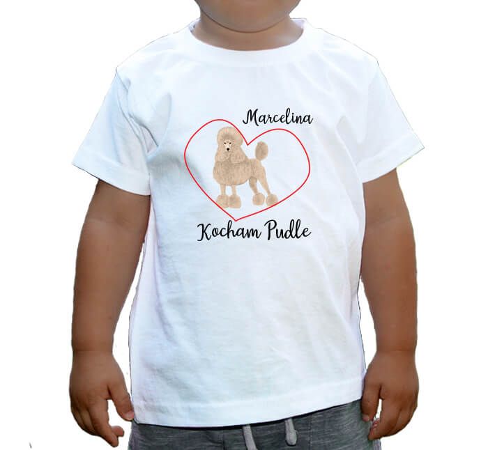 Koszulka z białym pięknym pudlem oraz imieniem dziecka.