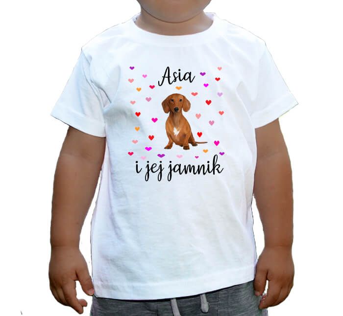 Koszulka z jamnikiem, który jest otoczy drobnymi serduszkami oraz imieniem dziecka.