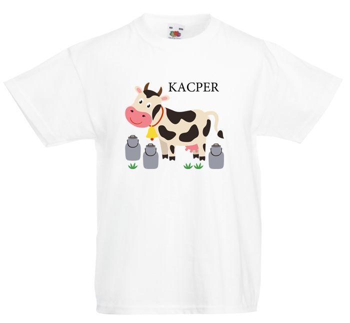 Koszulka Krowa z imieniem. Przy biało-czarnej krówce stoją szare kanki na mleko.