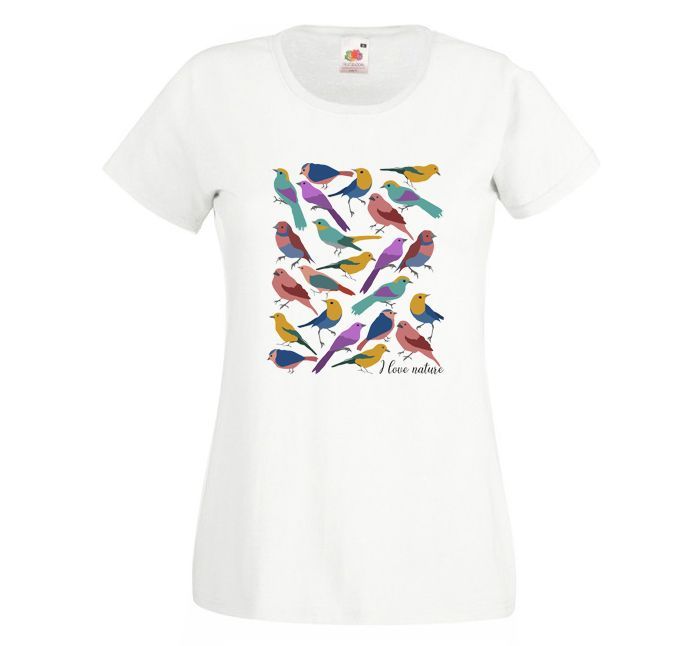 Koszulka z kolorowymi ptaszkami i napisem I love nature.
