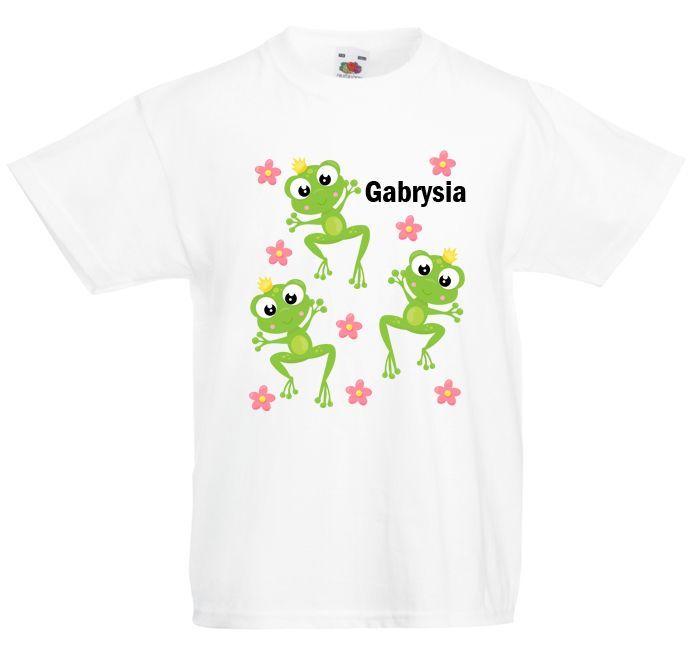 Koszulka idealna dla dzieci z grupy przedszkolnej z nadrukiem zielonych żabek i różowych kwiatków. Koszulka z dowolnym imieniem. Koszulka z żabkami dla dziewczynki ma różowe kwiatuszki, w wersji dla chłopba ma brązowe pałki wodne. Oczywiście od Ciebie zależy co wybierzesz. Żabki są bardzo radosne. Każdy lubi je obserwować. W niektórych budzą odrazę, a w innych zaciekawienie i chęć złapania.