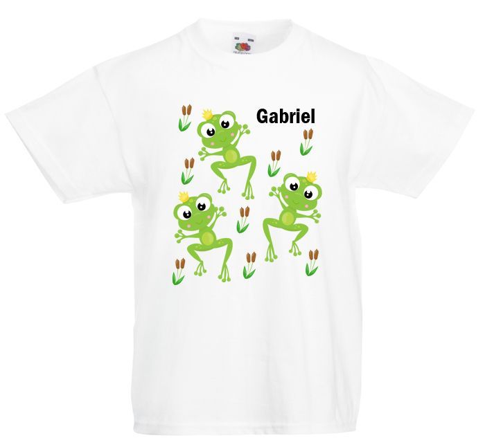 Koszulka z żabkami i pałkami tataraku oraz z imieniem dla małego przedszkolaka lub dziecka po prostu. Żabki wesoło skaczą wśród listowia i pałek. Są pokazane w pozycji całkiem rozciągniętej. Mają radosne miny. Koszulka z żabkami dla chłopca ma dziecięcy charakter. Nadruk jest wytrzymały i wyraźny. W grupie żabeek taka koszulka na pewno się spodoba.