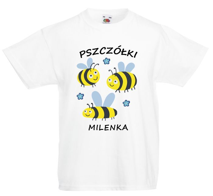 Koszulka z imieniem dla małego dziecka z pszczółkami. Pszczoły są bardzo pracowite i pożyteczne. Zawsze jest ich dużo w ulu. Codziennie wykonują swoje obowiązki. Dziecko w przedszkolu też jest pilne. Uczy się wielu cikawych rzeczy.