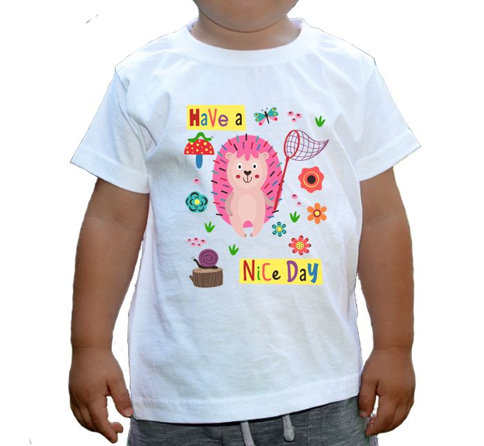 Koszulka dla dziewczyny z różowym jeżem, który łapie motyle. Sympatyczny jeż ma różowe ciałko i ciemniejsze igły na grzbiecie. W ręce trzyma siatkę na motyle. Zapewne będzie je łapał. Wokół niego są kolorowe kwiatki. Na grafice znalazł się również muchomorek z gąsieniczką oraz niski pieniek ze ślimakiem.