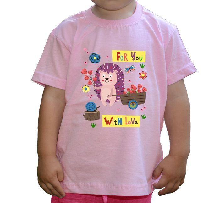 Koszulka dla dziewczyny z fioletowym jeżem. Jeż ma w ręce czerwony kwiatek. Za nim stoi cały wóz z kwiatami. To jest mały ogrodnik albo florysta. Kocha kwiaty i je rozdaje innym. Niedaleko jeża jet mały ślimak, który z zaciekawieniem patrzy co się wydarzy. Ślimak stanął na podwyższeniu jakim jest drewniany pieniek. Całość grafiki przyozdabiają kolorowe kwiatki.
