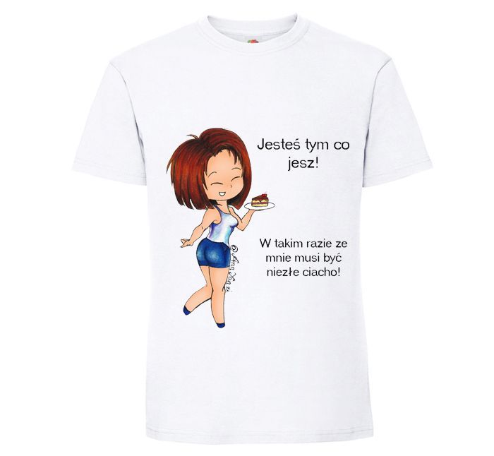 Koszulka męska Cake z nadrukiem Skoro jestem tym co jem, to niezłe za mnie ciacho. Ta koszulka występuje w dwóch modelach: damskim i męskim i w obu przypadkach wygląda świetnie. Sam tekst jest uniwersalny i pokazuje, że właściciel podchodzi do życia z dystansem. Projet od Ann Yan Zi
