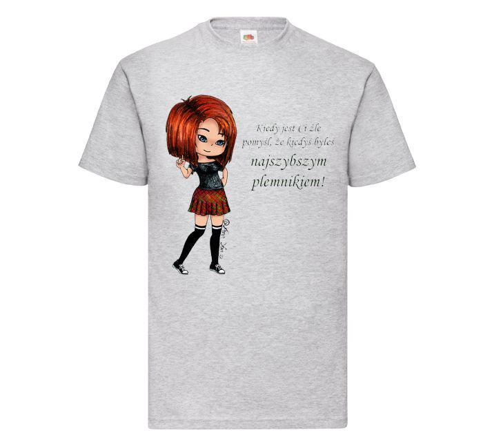 Koszulka damska Plemnik. Gdy masz doła, gdy Ci źle spójrz na napis na tej koszulce. W życiu są różne sytuacje i choć może Ci się właśnie wydawać, że prześladuje Cię prawdziwy pech, wiedz, że na starcie było inaczej. Czy tak naprawdę Twoje poczęcie zaczęło się od sukcesu, teraz tylko wystarczy ponownie wskoczyć na wzrostową falę prowadzącą do celu. Koszulka ma wyjątkowy, unikatowy nadruk zaprojektowany przez Ann Ya Zi. Tym razem Anka ubrana jest czarną koszulkę i kraciastą krótką spódniczkę. Wysokie zakolanówki z białym paskiem i wygodne buty podkreślają zawadiacki styl Anki.