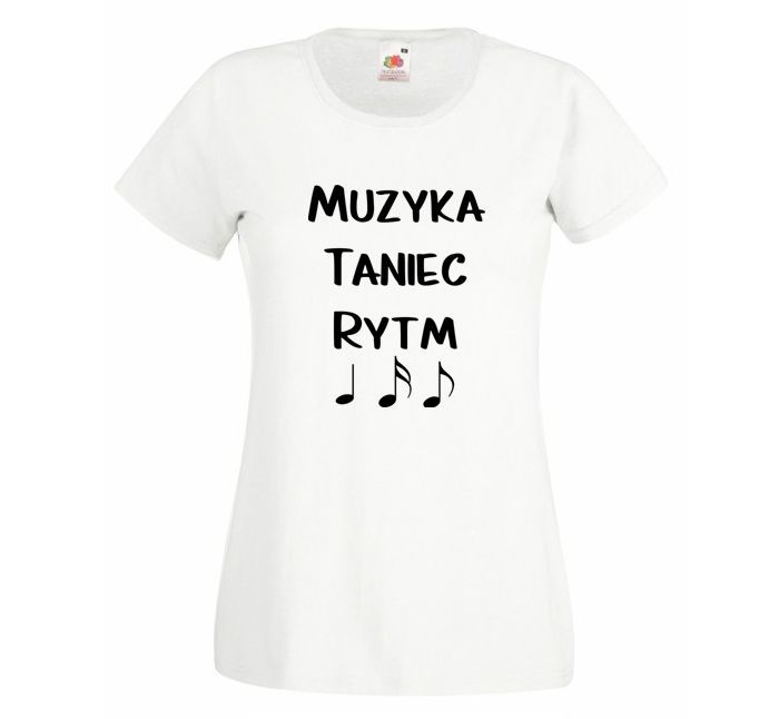 Koszulka damska z nadrukiem napisu Muzyka Taniec Rytm oraz z nutkami.