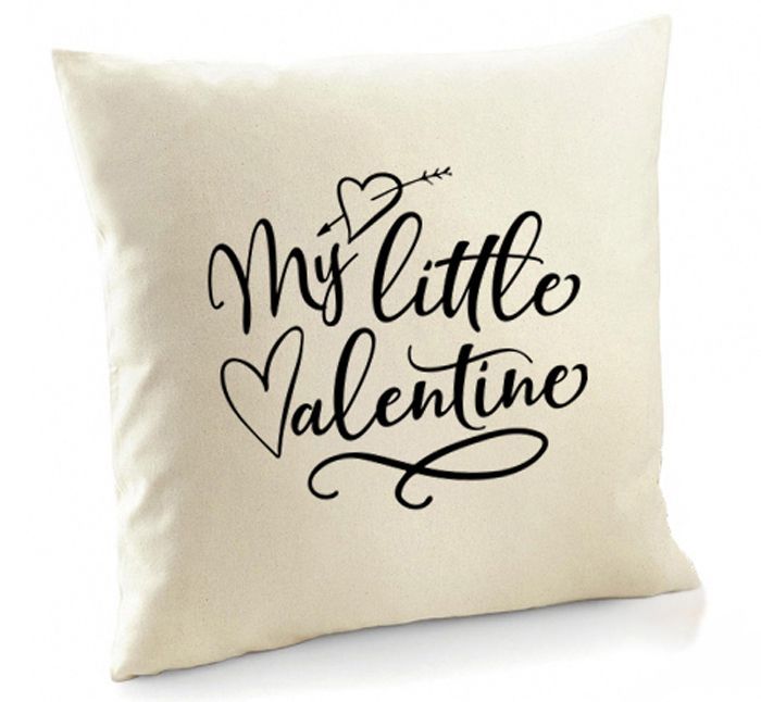 Poduszka My little valentine z czarnym napisem. Kolor nadruku może ulec zmianie i napis może być np. czerwony. Poduszka z nadrukiem Moja mała walentynka ucieszy Twoją drugą połówkę.